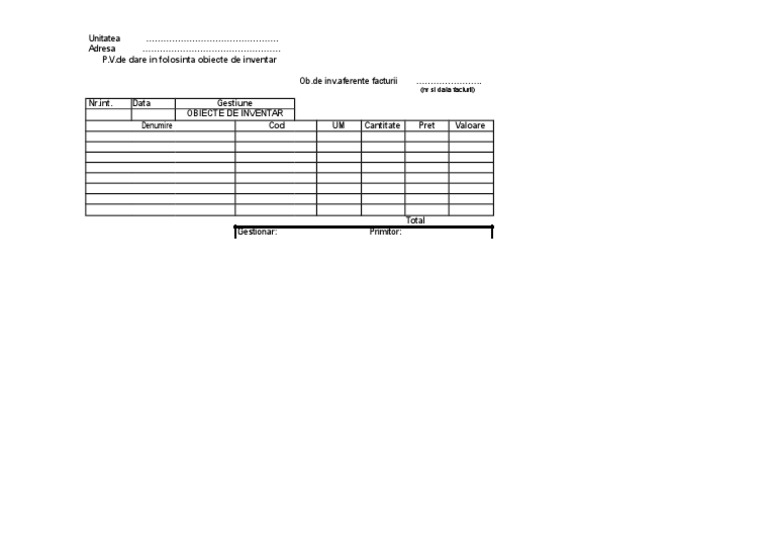 vizitati articolul complet aici : https://vlaros-print.com/fisa-de-evidenta-a-obiectelor-de-inventar-in-folosinta.html Meniul obiecte de inventar gestioneaza toate obiectele aflate in afara bilantului. valabil la 03 sep 2019. Ca exemple de obiecte de inventar pot fi specialiștii recomandă ținerea unui registru/catalog al obiectelor de inventar (fie el în format electronic, fie tipărit) pentru o mai eficientă gestiune a.