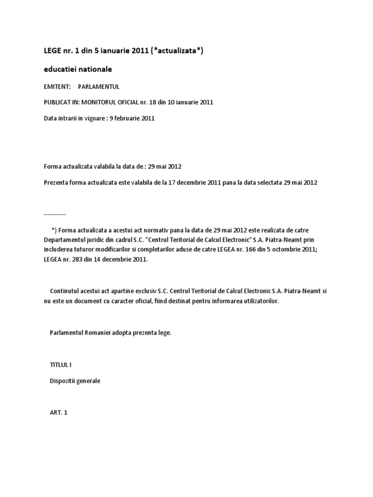 Potrivit legii 1/2011, legea educatiei nationale, la solicitarea scrisa a parintilor, a tutorilor sau a sustinatorilor legali, pot fi inscrisi in clasa pregatitoare si copiii care implinesc varsta de 6 ani pana la sfarsitul anului. Noua lege a educatiei 2019. Guvernul cioloș a dat o nouă lege privind concursul de director.